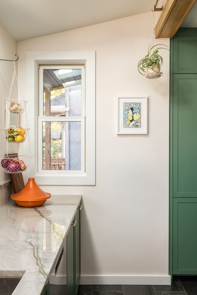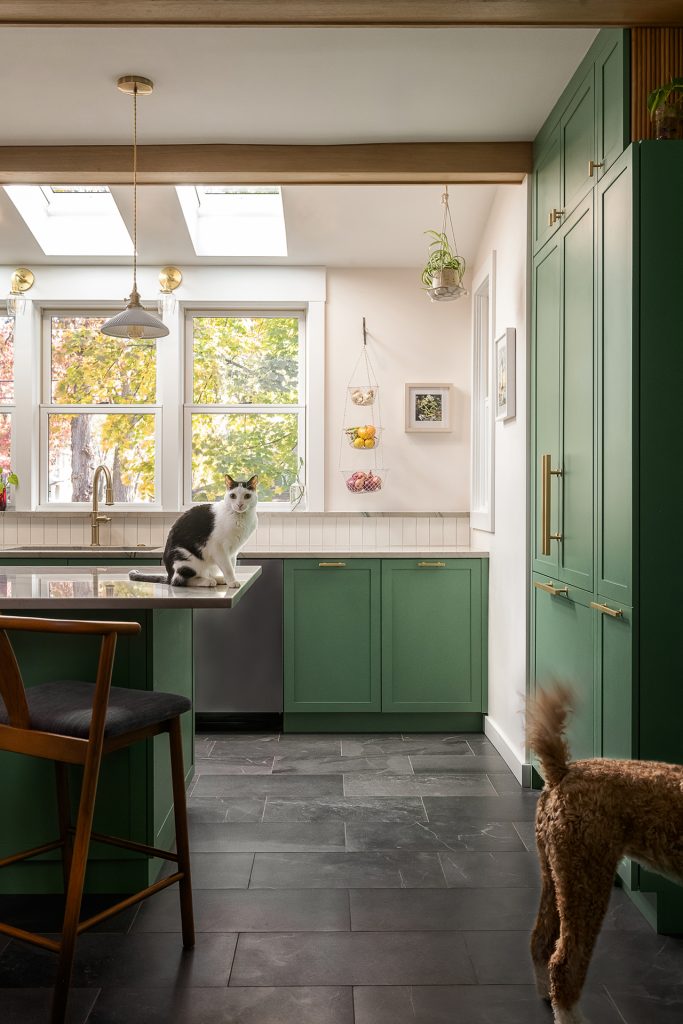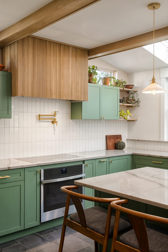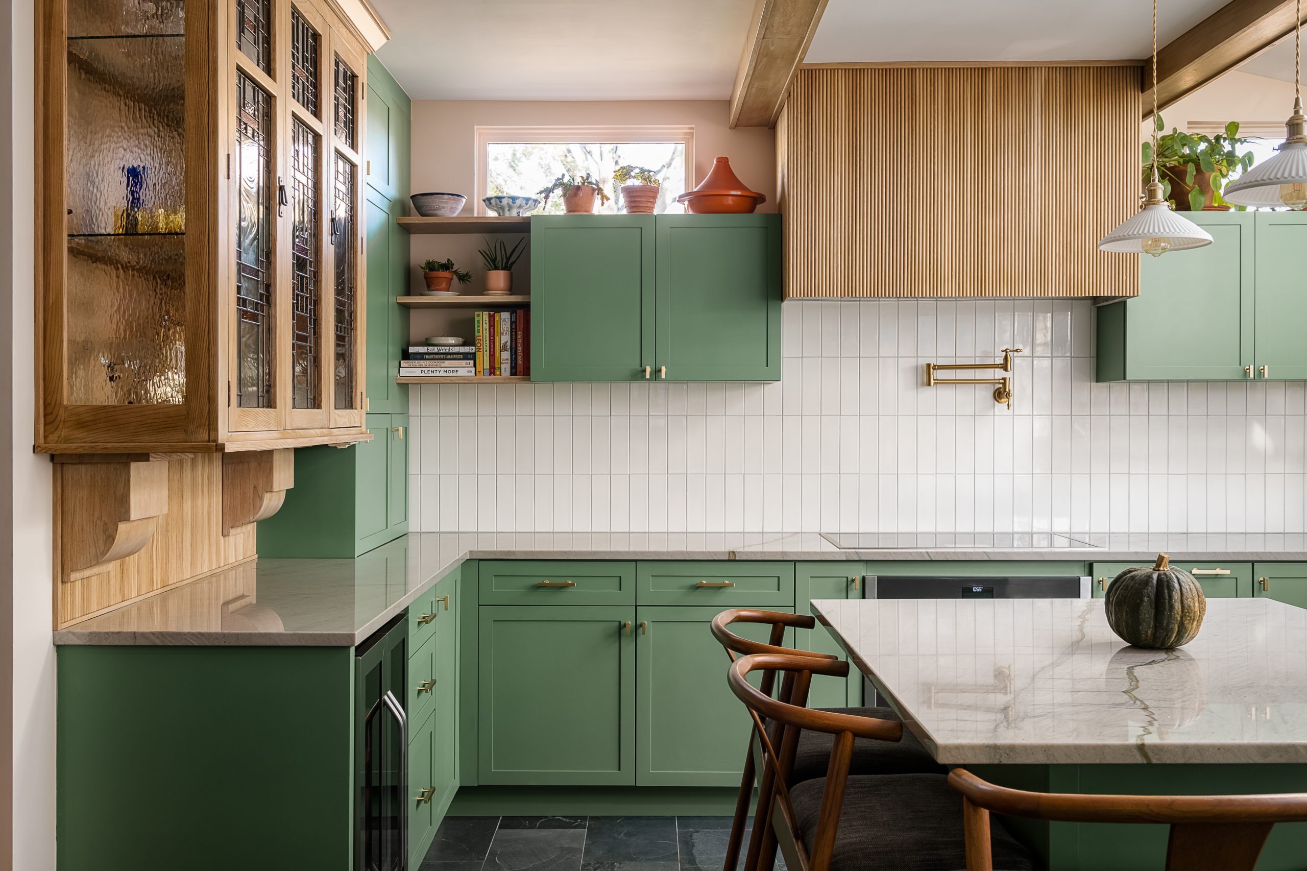Paying tribute to the popular architectural style of the Oak Park’s roots, Christina of Townsend Design Co marries functional space with mid-century modern touches. This kitchen renovation combines organic elements, bold color, and stunning stained glass cabinetry.