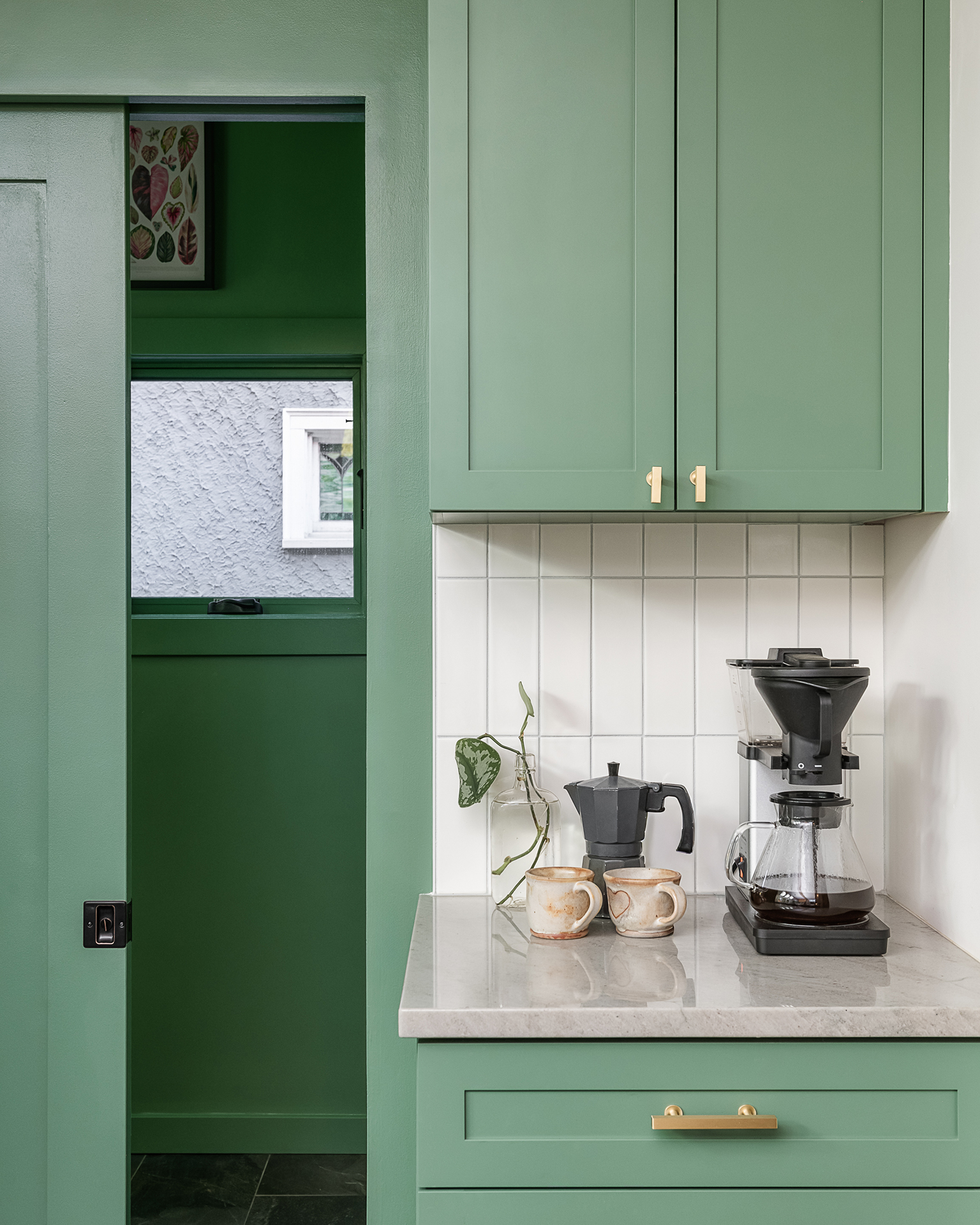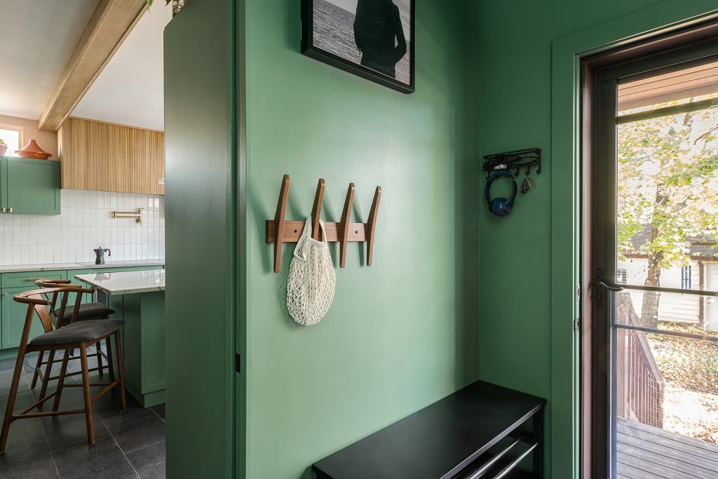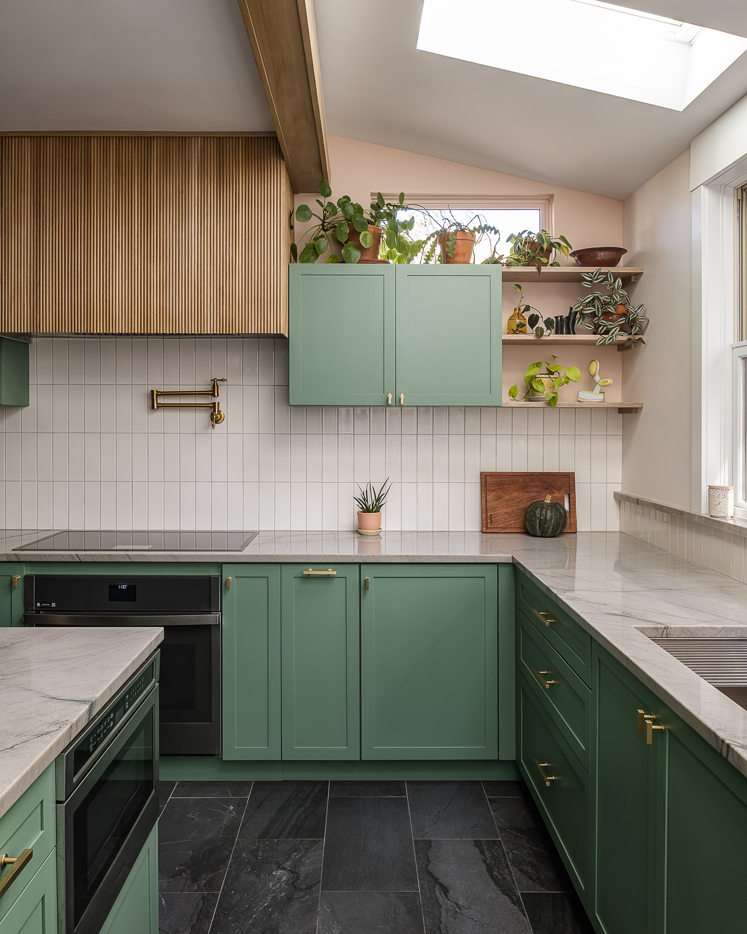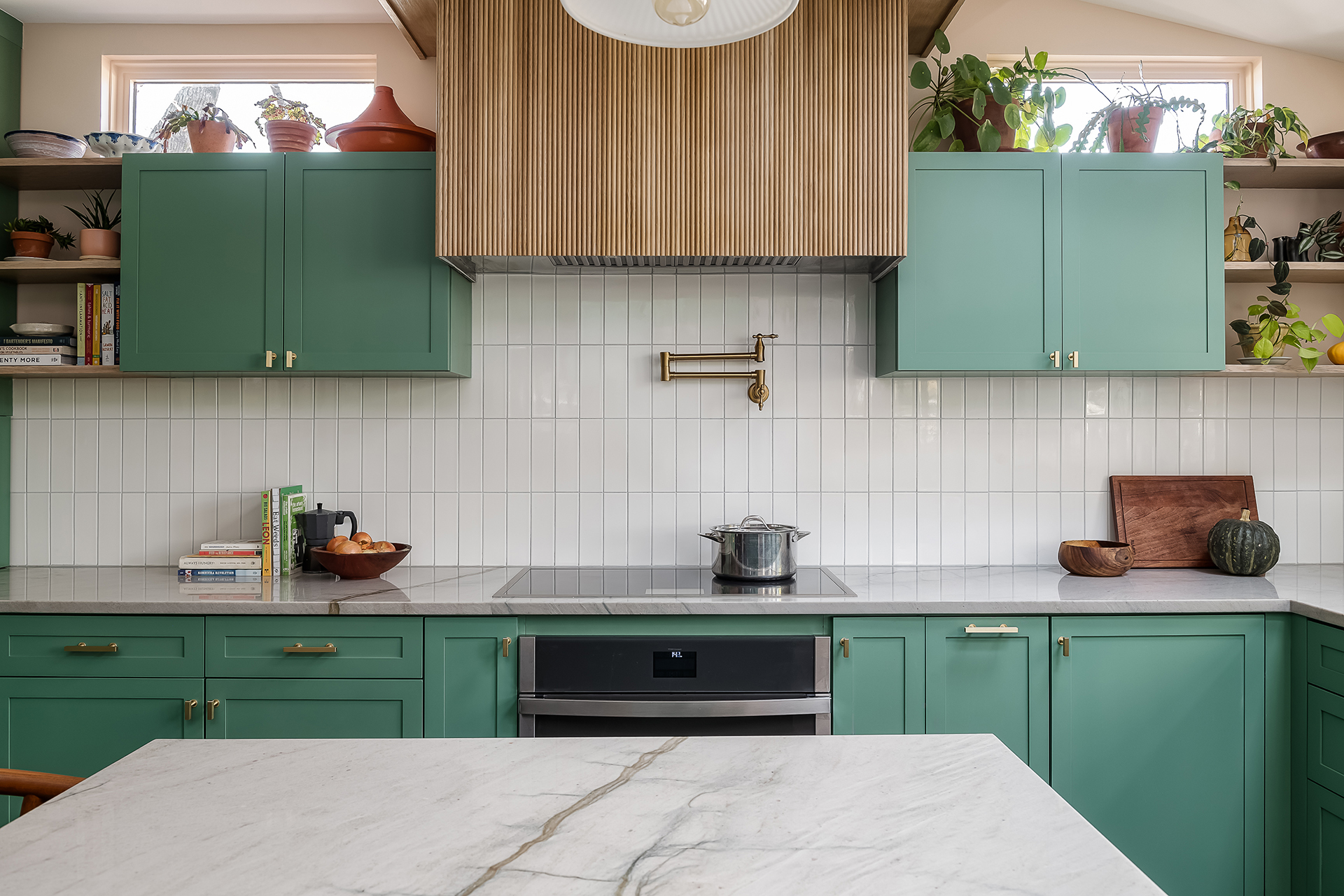 Paying tribute to the popular architectural style of the Oak Park’s roots, Christina of Townsend Design Co marries functional space with mid-century modern touches. This kitchen renovation combines organic elements, bold color, and stunning stained glass cabinetry.